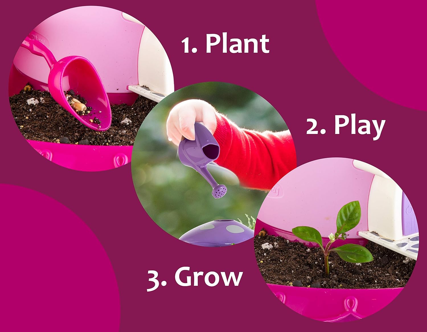 let little ones garden like the grown-ups. Kids will love planting and watching their own little garden grow with Advanced Play Garden Set. Plant, Grow, Play, this kit contains everything necessary to plant a tiny garden and watch it take shape. Growth is guaranteed, but timing can vary depending on environment and care given. Includes everything you need a shovel, trowel, garden rake, water can and features fairy garden accessories: 2 pink flowerpot, packet of 5 magical seed mix, 2 soils , toadstool. Detailed planting instructions included. Play garden tools made in perfect size for little hands and curious minds, it gives them a connection to nature and a sense of satisfaction at having nurtured a living thing. Just relax at the fairy garden house with the beautiful songs and charming details.